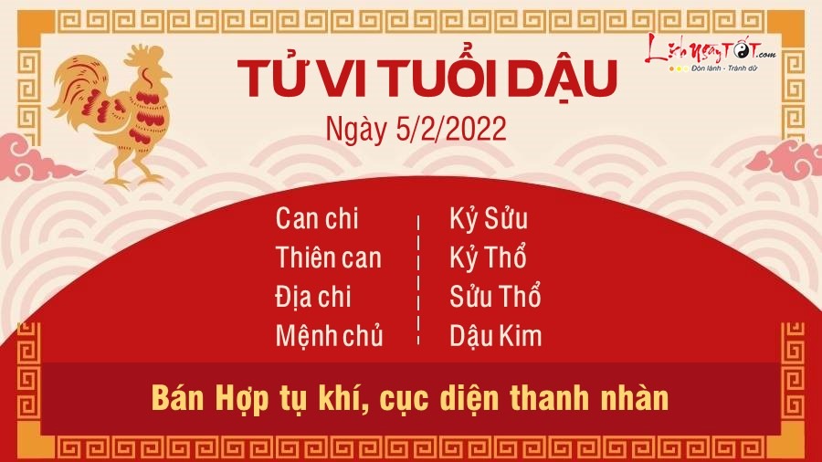 Sửu Dậu Bán Hợp giúp người tuổi Dậu có được cục diện khá tốt, thanh nhàn, vui vẻ và dễ có được những cuộc trò chuyện vui vẻ trong ngày mùng 5 này. Thậm chí những cuộc gặp gỡ đó còn giúp bạn có thêm nhiều cơ hội giúp công danh thăng tiến sau này. Hôm nay mọi chuyện đi được theo đúng quỹ đạo vào mong muốn của bản mệnh nên bạn có thể tranh thủ cơ hội này để lên những kế hoạch cho công việc sau Tết của mình. Việc có sự chuẩn bị tốt sẽ giúp bạn nhanh chóng lấy lại nhịp độ cần có khi trở lại công việc, không bị tình trạng uể oải ghìm bước. Ngày này Thực Thần còn đưa tới những cơ hội cải thiện tài chính đối với con giáp này. Có thể ngày mùng 5 Tết này bạn còn được người khác mừng tuổi. Hoặc khi tham gia trò chơi nào đó bạn giành về phần thắng và được thưởng quà có giá trị.