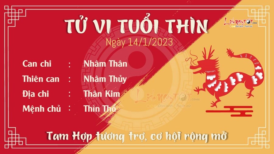Được Tam Hợp cục nâng đỡ, người tuổi Thìn làm gì cũng thuận lợi, cơ hội rộng mở cho con giáp này phát triển. Nhờ vậy mà tinh thần của con giáp này tràn đầy hứng khởi. Công việc được giải quyết hiệu quả hơn, hiệu suất tăng cao giúp bạn trở nên nổi bật hơn so với đối thủ. Chẳng những vậy, tử vi ngày mới còn dự báo bản mệnh rất có lộc làm ăn trong ngày hôm nay. Đặc biệt những người làm trong lĩnh vực đầu tư, kinh doanh có thể tìm được những mối hợp tác đáng tin cậy, mang lại nhiều triển vọng cho tương lai. Càng gần Tết tiền càng đổ ào ào về túi, bạn đang làm rất tốt. Thổ sinh Kim cũng giúp phương diện tình cảm thăng hoa rực rỡ. Bạn và người ấy nhanh chóng xóa bỏ những mâu thuẫn tình cảm trước kia và tạo dựng những kỉ niệm đẹp đẽ bên nhau. Người đang đơn phương có thể tranh thủ cơ hội này để tiến thêm một bước, bày tỏ tấm lòng với đối phương, xác suất thành công khá cao đấy.