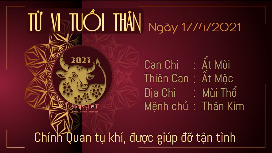 Chính Quan sẽ đem đến nhiều may mắn cho con giáp tuổi Thân trong ngày hôm nay liên quan tới công việc. Có người còn may mắn lọt vào “mắt xanh” của cấp trên khi chứng minh được bản lĩnh, bạn có thể được cất nhắc bạn lên một vị trí cao hơn nhờ vậy. Ngũ hành Thổ sinh Kim che chở mang cho bạn tin vui trong chuyện tình cảm. Trong một ngày cát khí lan tràn như hôm nay rất thích hợp cho việc ký kết hợp đồng, hợp tác làm ăn. Nhưng không phải ai cũng phù hợp, bạn nên tránh làm việc chung cùng người tuổi Kỷ Sửu, Quý Sửu, Tân Mão, Tân Dậu trong ngày hôm nay. Nếu có thể hãy chọn lịch trình thích hợp hơn vào ngày khác.