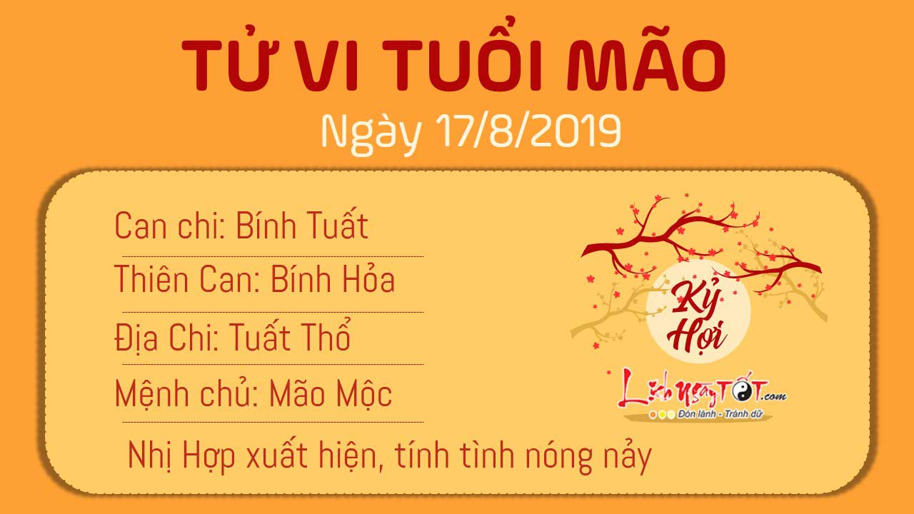 Nhị Hợp xuất hiện, người tuổi Mão rất coi trọng thể diện. Bản mệnh không muốn bất cứ ai lời ra tiếng vào sau lưng mình và sẵn sàng phản kháng khi có người bất đồng ý kiến. Đây là nguyên nhân khiến mọi người cảm thấy bạn khá nóng nảy. Tuy nhiên, nếu biết cách cư xử khéo léo thì hôm nay là một ngày khá thích hợp để bạn xây dựng các mối quan hệ làm ăn. Bản mệnh có thể tìm được những đối tác tiềm năng, hãy có cách giữ mối quan hệ với họ. Chính Ấn cho thấy nếu bản mệnh muốn thăng tiến trong sự nghiệp thì không nên bảo thủ.