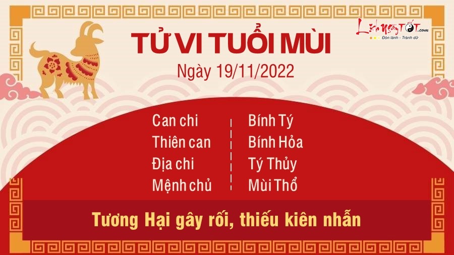 Tương Hại Thái Tuế án ngữ, người tuổi Mùi trở nên xốc nổi, thiếu kiên nhẫn, dễ xảy ra xích mích với người khác. Ngày này bạn tốt nhất nên bình tĩnh khi trao đổi công việc, tìm ra cách giải quyết tích cực chứ đừng nóng giận rồi to tiếng, điều đó sẽ không hề có lợi cho bạn chút nào. Hôm nay cũng không phải là thời điểm lý tưởng để con giáp này lao mình đầu tư vào các hạng mục mang tính chất mạo hiểm vì có thể vướng vào rắc rối không đáng có. Tốt nhất nên tiếp tục theo dõi thị trường và chờ đợi thời cơ tốt hơn. Chậm mà chắc còn hơn là mất tiền vì sự nóng vội của bản thân. Ngũ hành xung khắc cản trở nên bản mệnh cũng tỏ ra bướng bỉnh hơn, vận trình tình cảm có phần sa sút, hôn nhân bất ổn. Người độc thân tuy vẫn có đối tượng theo đuổi nhưng quan trọng là bản thân bạn không có cảm xúc nên mọi chuyện cũng chẳng đi tới đâu.