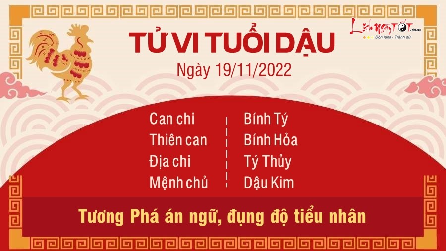 Dậu Tý Tương Phá, người tuổi Dậu có nguy cơ đụng độ tiểu nhân hoặc vấp phải những chiêu trò cạnh tranh bất lợi từ đối thủ. Bạn nên kiểm soát công việc, làm mọi thứ kín kẽ hơn, chớ vì chủ quan mà tạo cơ hội cho kẻ xấu lợi dụng sơ hở, gây bất lợi cho mình. Vận trình tài lộc tuy có tài tinh chiếu mệnh nhưng được dự báo vẫn tương đối thăng trầm, rất khó nói trước được. Có thời điểm tiền bạc ào ào đổ về, thậm chí con giáp này còn phát tài. Song do hung vận quá lớn nên vận trình có thể sa sút bất cứ lúc nào. Một vài sự cố phát sinh bất ngờ khiến bạn phải chi một số tiền không nhỏ, cần có kế hoạch chi tiêu kẻo lâm vào cảnh túng thiếu. Điểm sáng trong ngày đến từ phương diện tình cảm nhờ ngũ hành tương sinh. Hôm nay tuổi này có đào hoa chiếu mệnh, người độc thân có thể sẽ tìm được một nửa ưng ý với mình sau bao đêm ngóng chờ. Đây cũng là cơ hội để các cặp đôi tháo gỡ khúc mắc, hâm nóng tình cảm như xưa.