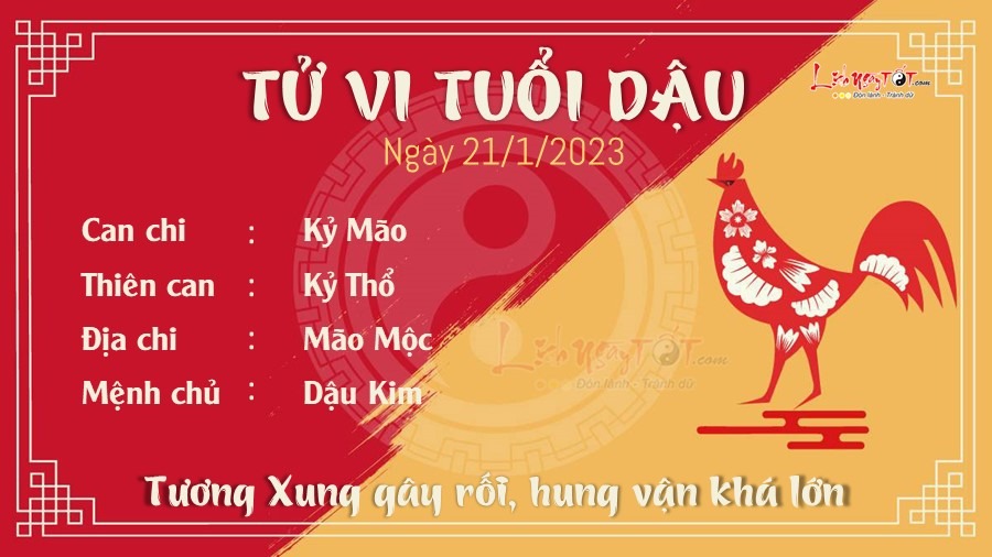 Trong ngày Mão Dậu Tương Xung, tuổi Dậu có điềm báo hung vận khá lớn trong ngày 30 Tết. Vận trình tình cảm thiếu sự hòa hợp. Giữa con giáp này và nửa kia có nhiều vấn đề mâu thuẫn vẫn chưa được tháo gỡ, nguy cơ chiến tranh lạnh kéo dài sang cả những ngày đầu năm mới. Đây là điều chẳng ai mong muốn nên hãy cố gắng ngồi lại nói chuyện để cùng nhau giải quyết vấn đề. Ngày này tuổi Dậu cũng nên thận trọng với những mối quan hệ xã giao của mình. Bạn có thể sẽ sẽ xảy ra cự cãi hàng xóm, bạn bè vì những câu đùa quá trớn. Dù có thân thiết đến đâu, bạn cũng nên cư xử có chừng mực, đừng tự gây rắc rối cho bản thân. Ngũ hành xung khắc cũng khiến người độc thân gặp nhiều khó khăn trong việc tìm kiếm mối quan hệ phù hợp. Bạn cảm thấy mệt mỏi khi bị thúc giục chuyện kết hôn, khiến ngày nghỉ Tết trở nên vô cùng nặng nề. Có lẽ bạn còn có thể xảy ra bất đồng với người lớn trong nhà.