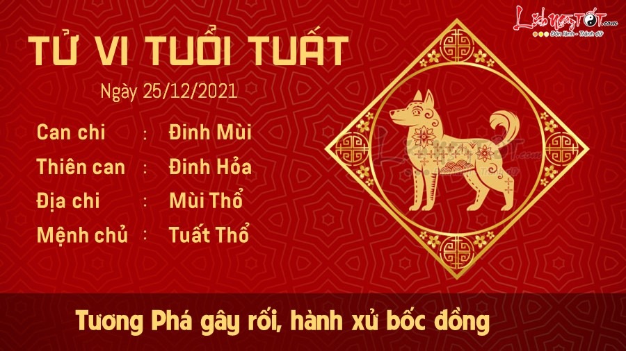 Cục diện Tương Phá có thể khiến người tuổi Tuất hành xử khá bốc đồng trong hôm nay nên cũng dễ phạm sai lầm. Đây là một ngày cảm xúc có phần lấn át lý trí, chính vì vậy đa số các quyết định và hành động của bạn trong đều bị ảnh hưởng bởi cảm xúc. Vậy nên, việc lên kế hoạch chi tiết những việc cần hoàn thành rất cần thiết trong lúc này. Hôm nay cũng không phải là ngày may mắn về tiền bạc của tuổi này. Bạn cần suy nghĩ thật cẩn thận, tránh các khoản đầu tư có độ rủi ro cao. Cần có sự suy nghĩ một cách thấu đáo, hoặc tìm kiếm lời khuyên từ những người có kinh nghiệm, nhờ thế bạn có thể đưa ra những quyết định một cách chính xác và không phải hối tiếc sau này. Thổ khí vượng khiến con giáp này trở nên thiếu kiên nhẫn với chính những người thân thiết của mình. Bạn dễ nổi nóng trước những yêu cầu của đối phương, thậm chí nạt nộ và làm tổn thương người kia. Bạn nên xem lại thái độ của mình trước khi tự tay đẩy những người bên cạnh ra xa.