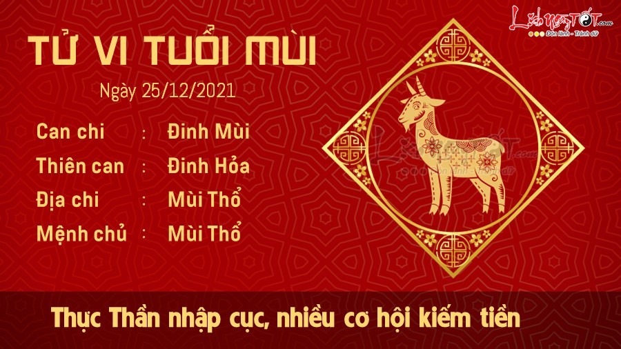Thực Thần nhập cục, hôm nay người tuổi Mùi có những quyết định sáng suốt trong các vấn đề liên quan đến tài chính. Bạn có nhiều cơ hội kiếm tiền, mở rộng hay đầu tư kinh doanh. Những ai buôn bán cũng thu về một khoản lợi nhuận kha khá cho riêng mình nhờ có tầm nhìn xa trông rộng. Người làm công ăn lương cũng có thể được người quen giới thiệu cho việc làm thêm phù hợp, tuy vất vả nhưng tiền bạc lại rủng rỉnh, thoải mái chi tiêu hơn. Nhân lúc này, bạn cũng cần có kế hoạch tích lũy thêm tiền bạc để mở rộng, phát triển những hình thức đầu tư mới nhằm đem lại nguồn thu nhập tốt hơn và ổn định hơn. Ngày ngũ hành Thổ vượng, bạn cũng nên chú ý đến sức khỏe của mình. Thời gian dài chỉ có công việc và mải mê kiếm tiền sẽ nhanh chóng bào mòn sức khỏe của bạn. Nên nhớ chỉ khi thể trạng được đảm bảo, bạn mới có thể yên tâm theo đuổi mục tiêu của cuộc đời mình.