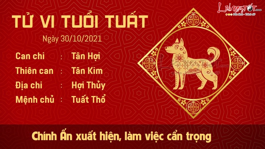 Người tuổi Tuất cho thấy sự chỉn chu, cẩn trọng với mọi nhiệm vụ mà mình được giao trong ngày có cát tinh Chính Ấn che chở. Bạn không muốn làm sai rồi lại phải tốn thời gian sửa chữa nên đã làm từng việc một khá cẩn thận. Dù sự cẩn trọng của bạn có thể khiến người khác cho rằng chậm chạm và mất thì giờ, song bạn tin rằng kết quả cuối cùng sẽ chứng minh rằng điều bạn làm không hề thừa thãi hay vô bổ. Đây là một thói quen tốt nên hãy cố gắng duy trì, đừng để bất kỳ tác nhân nào làm bản thân lung lay. Thổ khắc Thủy, để duy trì hạnh phúc gia đình, con giáp này nên học cách cảm thông và bao dung nhiều hơn. Có thể bạn có lý lẽ riêng của mình, song điều đó không có nghĩa bạn phủ quyết mọi ý kiến của đối phương và nhất nhất làm theo ý mình.
