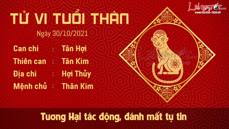 Chịu tác động trực tiếp từ cục diện Tương Hại Thái Tuế, người tuổi Thân có thể sẽ gặp vài rắc rối từ trên trời rơi xuống. Bản mệnh làm việc cẩn trọng, nhìn trước ngó sau nhưng vẫn không thể làm vừa lòng hết mọi người. Những lời xì xào khiến bạn cảm thấy mất tự tin khi thể hiện mình. Ngày này Kiếp Tài cũng khiến con giáp này cảm thấy bế tắc khi chưa tìm ra cách để cải thiện thu nhập. Thậm chí vì những xui xẻo gặp phải mà bạn còn có thể phải bỏ tiền túi ra khắc phục khiến tài khí hư hao nghiêm trọng. Các dự định đầu tư không nên tiến hành vào ngày này. Kim sinh xuất cho Thủy gây nên những vết nứt trong mối quan hệ tình cảm của con giáp này. Tình yêu cần sự chia sẻ từ cả hai phía, bạn nên lắng nghe nhiều hơn thay vì chỉ nói đến quan điểm cá nhân của mình. Hãy thông cảm và chia sẻ với những khó khăn của đối phương nhé.