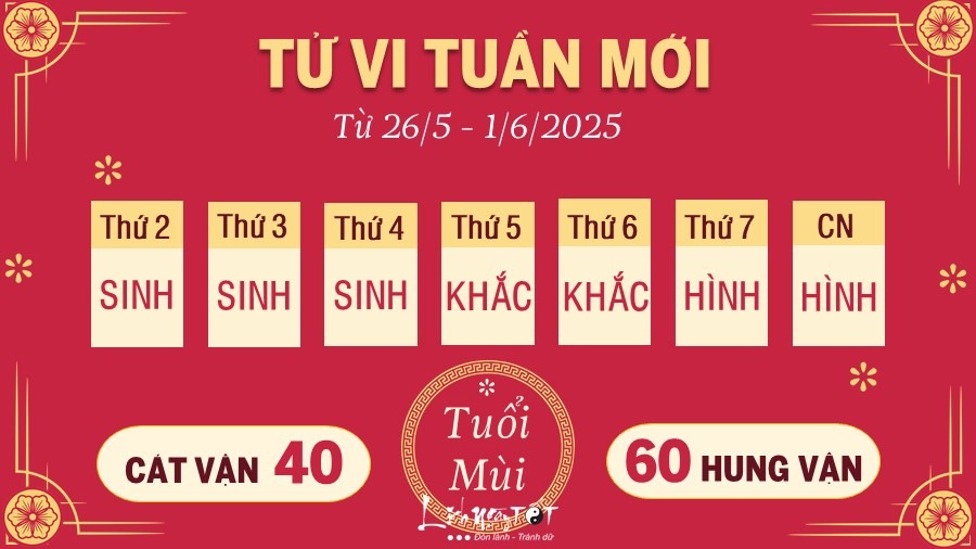 Tuần này, người tuổi Mùi chịu ảnh hưởng của Thiên Nguyệt, hung tinh này chủ yếu gây ra ưu tư, muộn phiền, tinh thần bất an và lo lắng. Điều này khiến bạn khó tập trung làm việc, tiến độ chậm trễ. Có thể có những vấn đề phát sinh khiến bạn phải đau đầu suy nghĩ. Lời khuyên là hãy tìm cách giải tỏa căng thẳng, giữ tinh thần lạc quan và tập trung vào từng nhiệm vụ nhỏ.