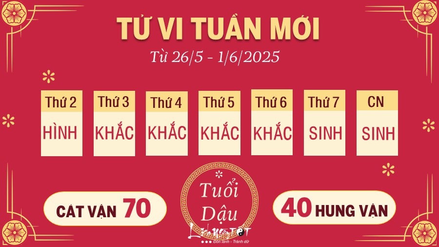 Theo dõi tử vi tuần mới, tin vui dành cho người tuổi Dậu là tuần này bạn được cát tinh Thiên Đức chiếu mệnh, mang lại vận trình bình ổn, nhiều may mắn và thuận lợi trong mọi phương diện.