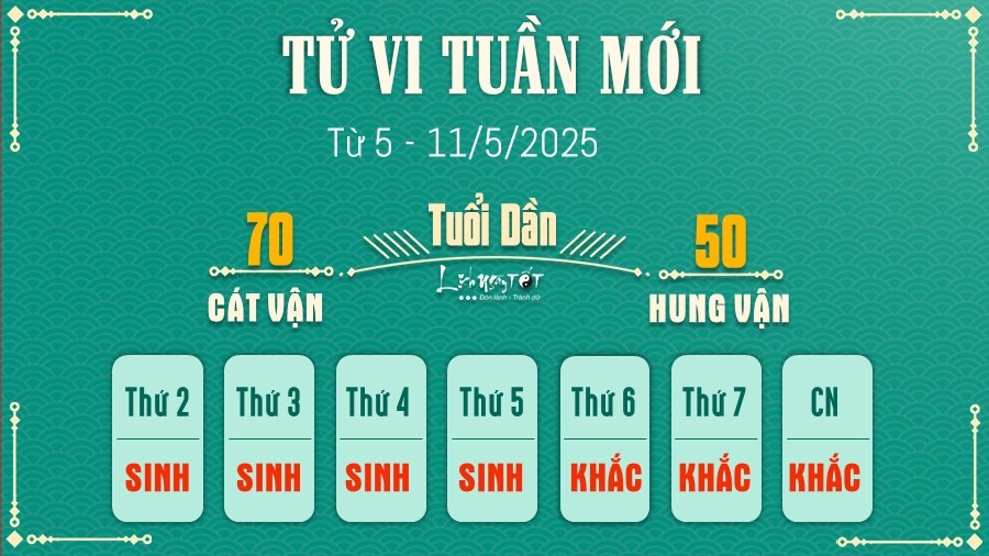 Xem tử vi khoa học, tuần mới mang đến những tín hiệu tích cực cho người tuổi Dần. Với sự hỗ trợ của sao Thái Âm, đặc biệt là nữ mệnh sẽ gặp nhiều may mắn hơn hoặc nhận được sự giúp đỡ từ quý nhân phái nữ. Đây là thời điểm thuận lợi để giải quyết các công việc quan trọng và mở rộng mối quan hệ.