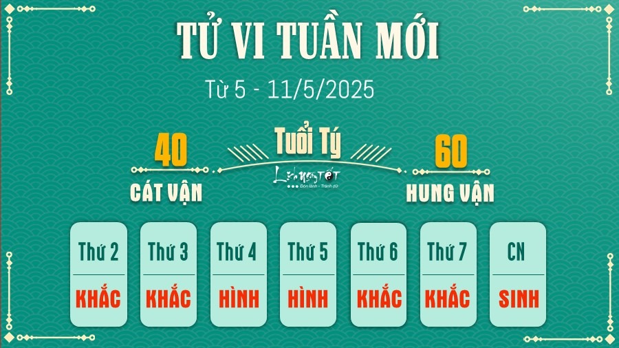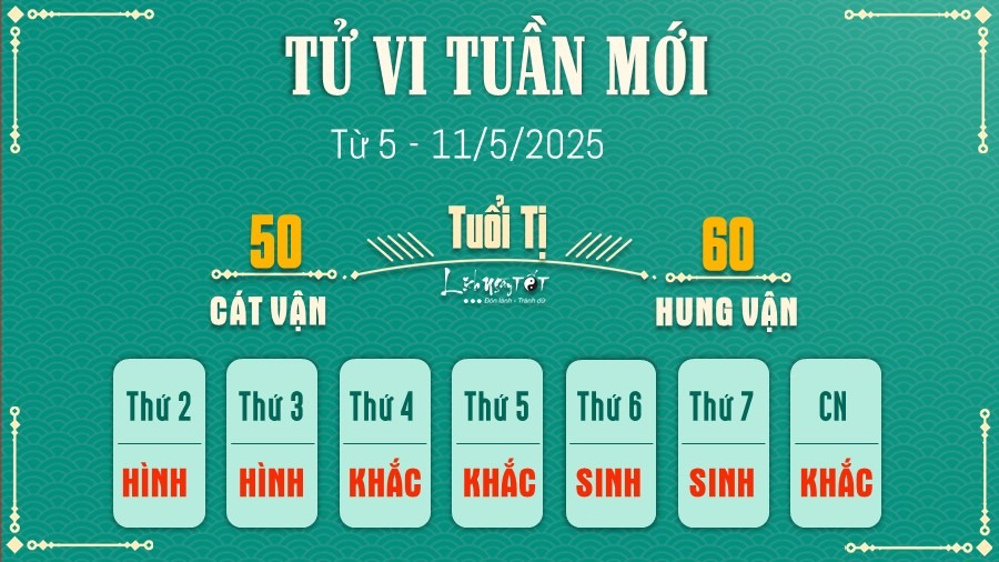 Để hóa giải phần nào ảnh hưởng này, tuổi Tị nên sắp xếp các việc quan trọng vào đầu tuần. Vận khí có xu hướng giảm dần về cuối tuần, việc để dồn công việc đến cuối tuần sẽ càng khó khăn và dễ thất bại. Sự chủ động và quyết đoán ngay từ những ngày đầu tuần là rất cần thiết.