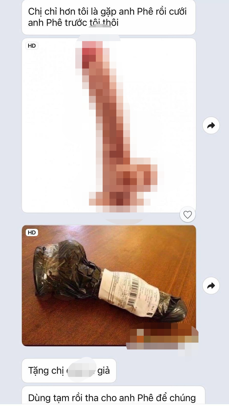 Cô vợ kể: “Ban đầu cô ta thể hiện mình là người yêu chồng em đến mù quáng, cả hai yêu nhau đắm say nhưng vướng phải cô vợ là em đây. Em đọc tin nhắn mà buồn cười cực độ. Kế tiếp, cô ta muốn em buông tay để cả hai người họ đến hạnh phúc với nhau. Bực mình nên em không thèm trả lời. Ai dè nó gửi sex toy đến địa chỉ nhà em”.