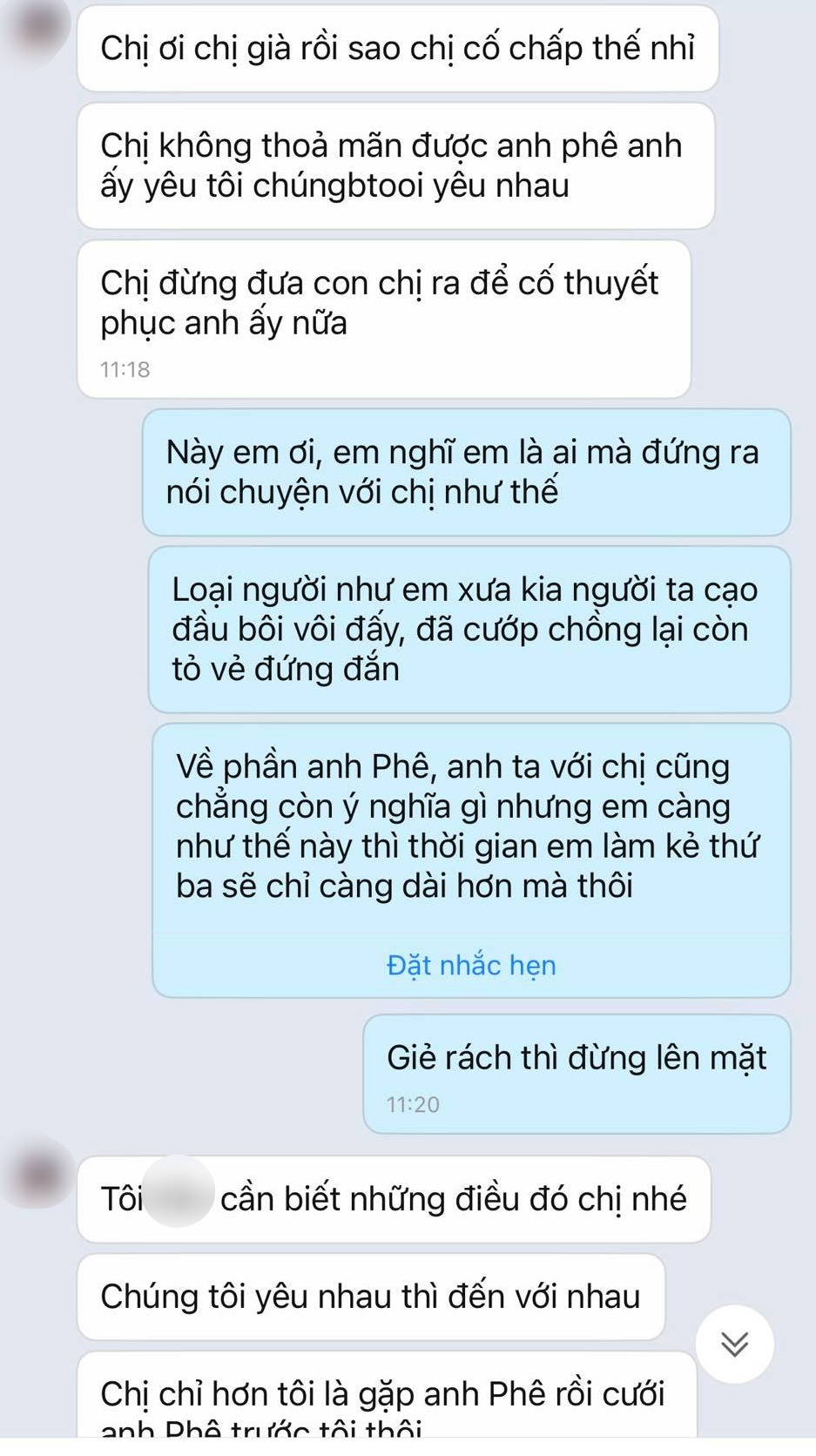 “Chị già rồi sao chị cố chấp thế nhỉ? Chị không thỏa mãn được anh P. chúng tôi yêu nhau. Chị đừng đưa con chị ra thuyết phục anh ấy”.
