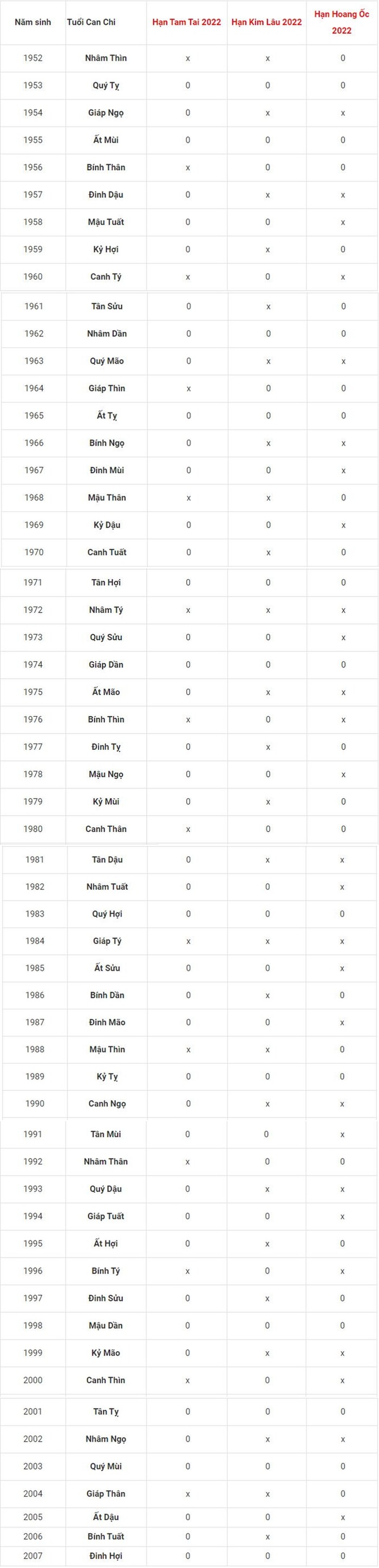 Dưới đây là bảng tra hạn Tam Tai – Hoang Ốc – Kim Lâu năm Nhâm Dần 2022. Ghi chú: X là "Phạm", 0 là "Không phạm".