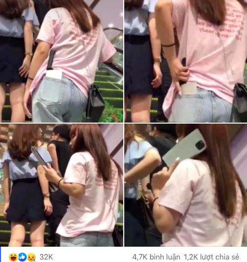 Chẳng là, bức ảnh đăng tải ghi lại hình ảnh của một cô gái khá trẻ đang đi thang máy tại 1 trung tâm thương mại. Sẽ chẳng có gì đặc biệt hay đáng nói nếu như đằng sau túi quần của cô nàng không có 1 món đồ gì đó hệt như con dao phay vậy.