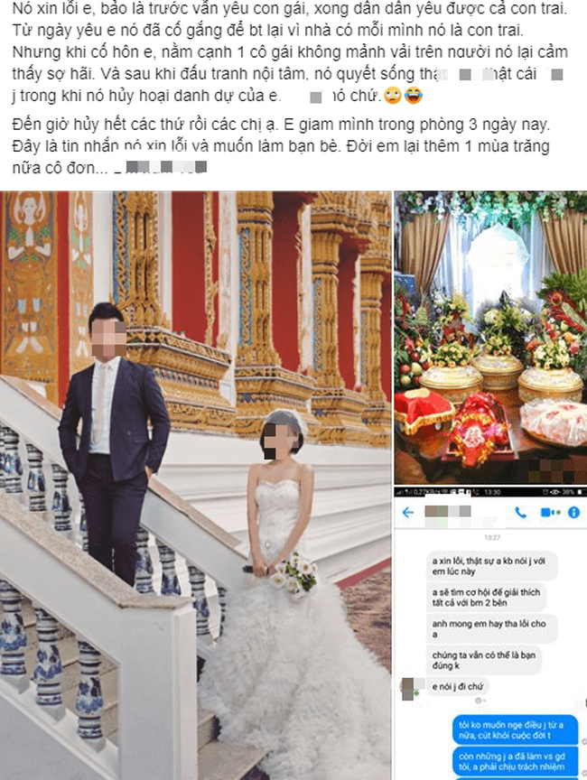 Những tưởng cô gái sẽ có một đám cưới lãng mạn, một cuộc sống trong mơ với gia đình hạnh phúc, nhưng nào ngờ, lời thú nhận của chàng trai lại khiến tất cả mọi thứ đổ bể. Biết rằng không thể trách chàng trai, nhưng giá như anh có thể nói ra điều này sớm hơn, có lẽ mọi chuyện đã không quá khó xử và ảnh hưởng nhiều tới cô gái đến vậy. Còn bạn, bạn nghĩ sao về câu chuyện này?