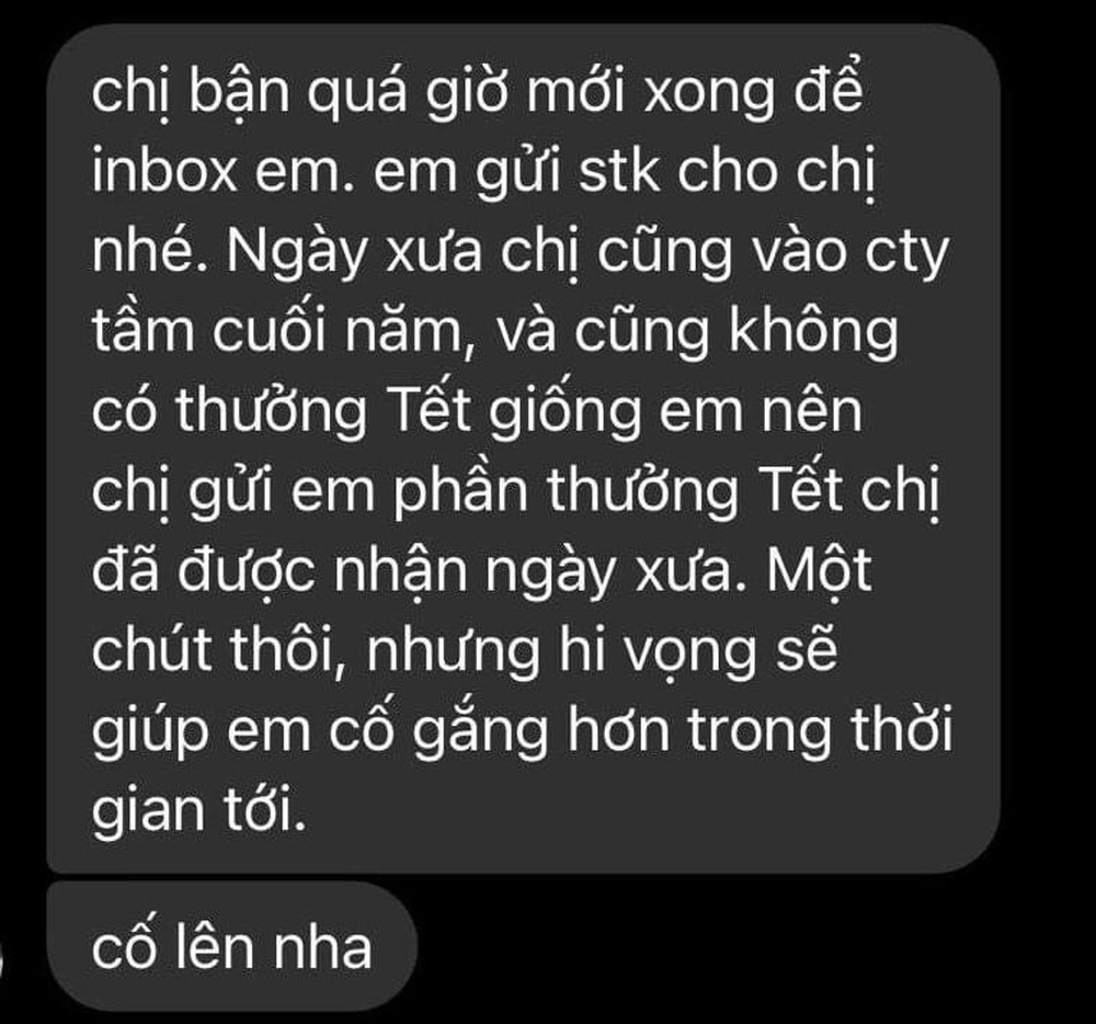 Chị ấy bảo mình gửi số tài khoản để chị chuyển cho một khoản tiền nho nhỏ gọi là có thưởng Tết. Chị bảo ngày xưa mới đi làm chị cũng vào công ty vào những ngày cuối năm, và cũng không được thưởng Tết như mình nên chị gửi mình một chút phần thưởng của chị hồi đó.