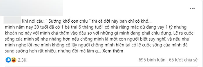 Câu chuyện ngay khi được chia sẻ đã nhận về hàng ngàn lượt theo dõi của cư dân mạng. Phần lớn ý kiến đều tỏ ra thương xót cho số phận của bà mẹ trẻ, khuyên chị mau chóng giải thoát cho bản thân.
