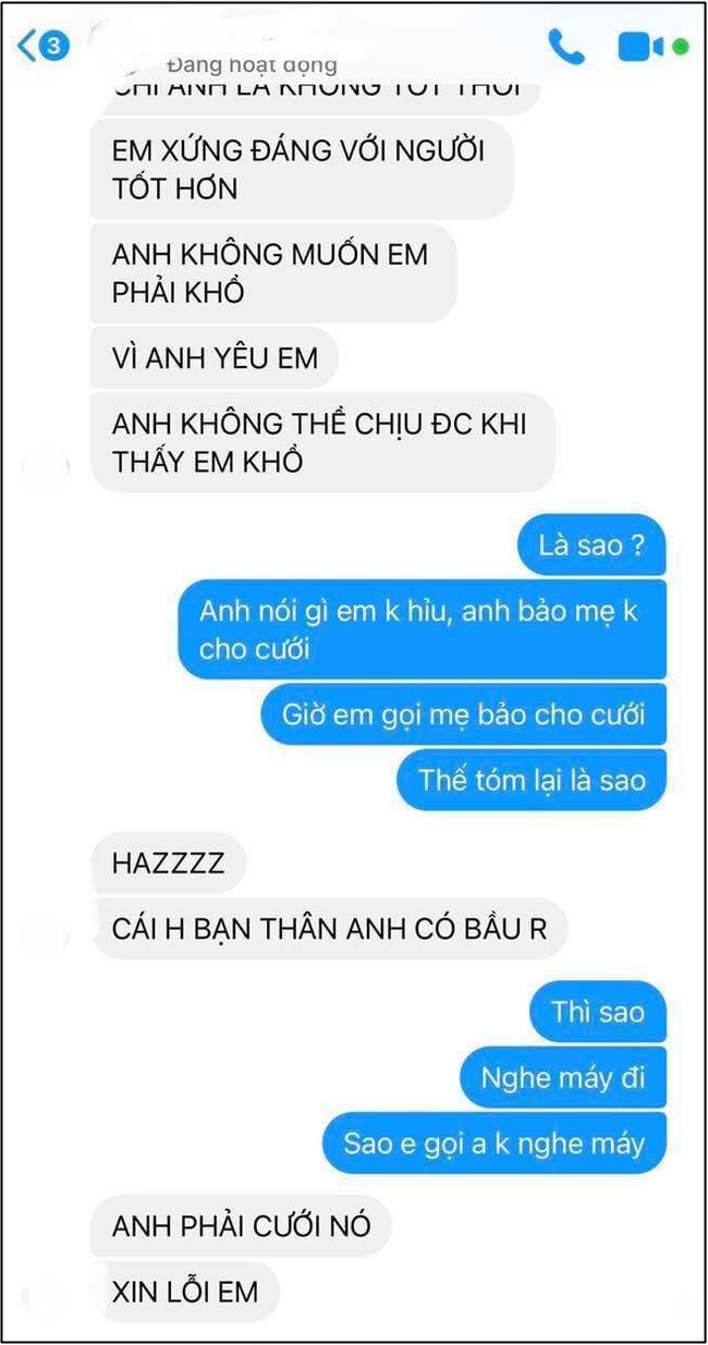 Từ đầu đến cuối toàn là lí do để chấm dứt chuyện yêu đương. Tuy nhiên, đến khi bị cô nàng vặc lại toàn bộ những câu nói thì anh ta mới nói thật: "Cái H. bạn thân anh có bầu rồi".
