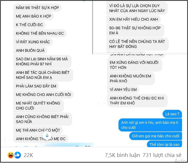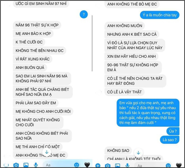 Mở đầu cuộc nói chuyện, anh ta đã rào luôn bằng một câu than vãn đầy nuối tiếc: "Ước gì em sinh năm 1997 nhỉ, năm 1996 thực sự không hợp, không thể cưới được, không thể bên nhau được vì quá xung khắc. Anh buồn quá!".
