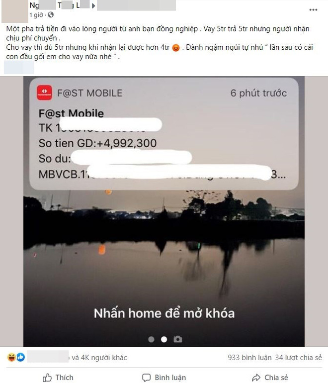 12/06/2021 14:33Vay 5 triệu mãi mới trả nhưng lại tự động 'ăn bớt' 8k phí chuyển khoản: Số tiền không nhiều nhưng là ý thức!