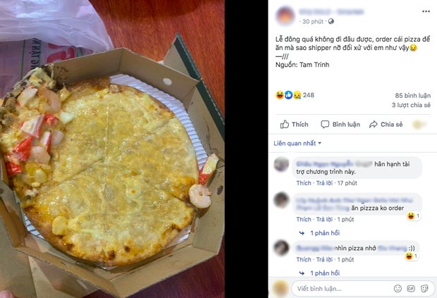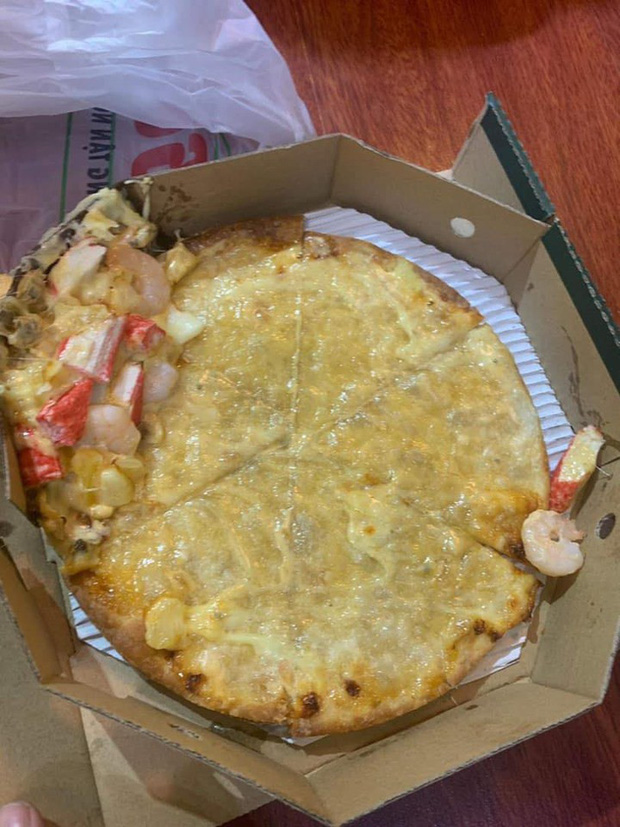 Điển hình là trường hợp của cô nàng T.T khi đặt pizza về nhà, biết là pizza ngoài đời thì không được như ảnh quảng cáo trên mạng rồi, nhưng khi mở hộp thấy 1 chiếc bánh “khoả thân” thì cũng khó lòng tưởng tượng nổi. Ngay lập tức cô nàng đã đăng lên MXH “kêu trời” và được 1 fanpage cộng đồng chia sẻ lại hình ảnh đó.