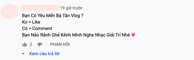 Với một kênh YouTube sở hữu hơn 4 triệu lượt đăng kí như bà Tân Vlog, việc liên tiếp các video không được "triệu view" thì đúng là tình trạng đáng báo động. Hiện tại, kênh YouTube của bà đang là "mồi ngon" cho các YouTuber mới tập tành làm video. Thay vì đọc bình luận của khán giả, bây giờ chỉ toàn thấy spam quảng cáo kênh vô bổ.
