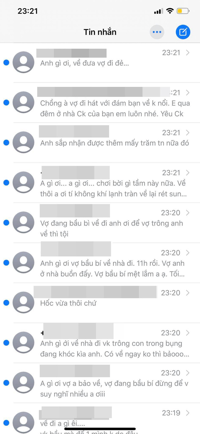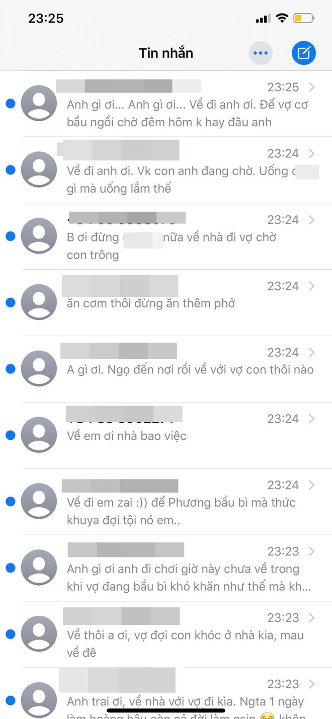 Lúc sau, vừa cầm chén lên thì có 1 số lạ gọi tới mình không dám nghe máy. Sau đó, khoảng 20 tin nhắn liên tiếp dội đến với nội dung 'Anh ơi về đi, nhậu vừa thôi. Ở nhà vợ anh mong".