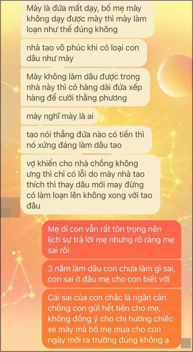 "Nhà tao vô phúc khi có đứa con dâu như mày. Mày không làm dâu được trong nhà thì có hàng dài đứa xếp hàng để cưới thằng P. Mày nghĩ mày là ai", người mẹ chồng gắt gỏng.