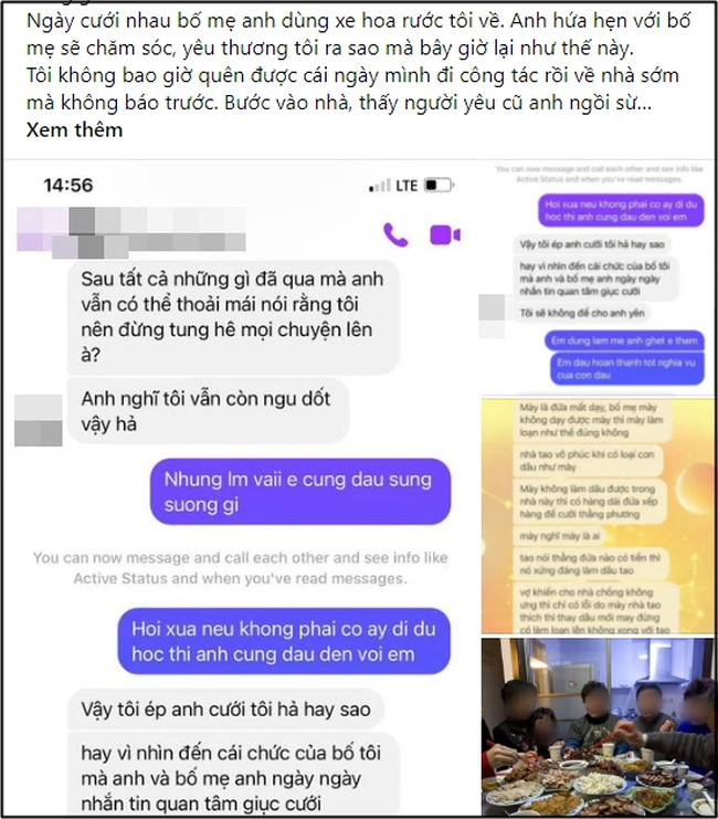 Trước đó, tôi đã nhìn thấy ảnh anh chụp với cô ta. Tôi hỏi thẳng nhưng anh nói rằng tôi nghi thần nghi quỷ. Đó là ảnh ngày xưa anh quên xóa đi bây giờ nó hiện ra, để anh xóa gấp. Lúc đó tôi vẫn tin nên ngu dại. Thế bây giờ thì sao, cô ta đến nhà anh, ăn uống vui vẻ với mọi người. Bố mẹ anh cũng chẳng thấy lấn cấn gì.