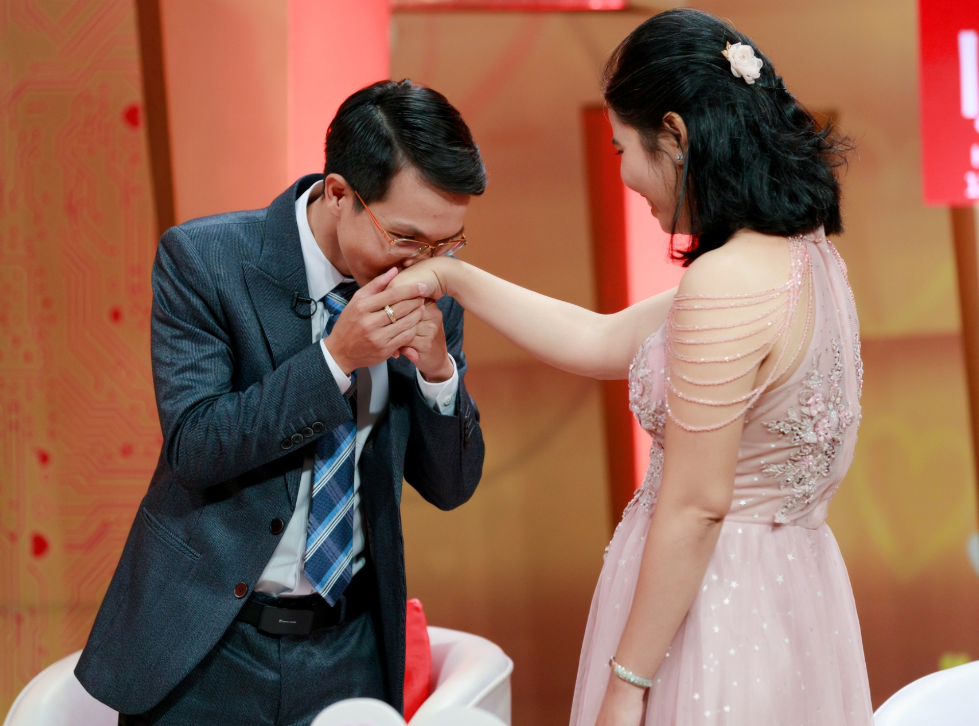 Sau một tuần “giả vờ yêu”, chị Hoàn muốn anh Mẫn hôn mình xem cảm giác thế nào. Trong khi anh Mẫn rụt rè, chị Hoàn lại chủ động. Chị hôn bạn trai lâu đến mức khiến anh đau môi.