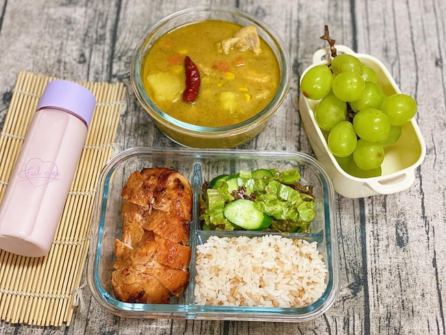 Các phần cơm chị Quỳnh Hoa chuẩn bị luôn đủ đầy dinh dưỡng. Lúc nào cũng có rau, thịt cá, hoa quả tráng miệng, không quên kèm trà sữa hoặc nước hoa quả. Bữa trưa được bày biện chỉn chu và đẹp mắt.