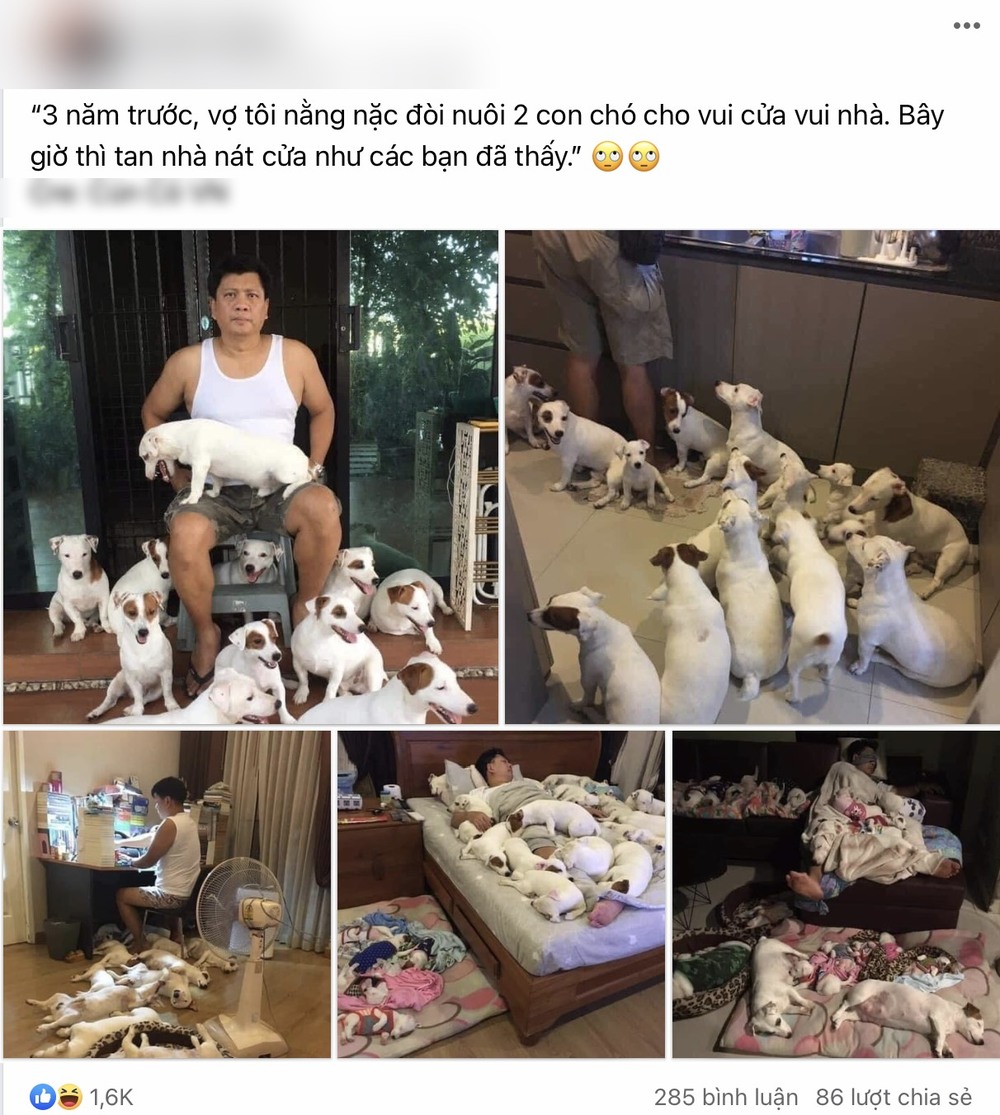 Mới đây, trên MXH, dân mạng đã vô cùng thích thú trước câu chuyện được một người chồng chia sẻ về chuyện nuôi cún của nhà mình. Cụ thể, người vợ nằng nặc đòi nuôi 2 con cún cho vui cửa vui nhà, thế nhưng, không ngờ sau 3 năm "bên nhau", từ 2 chú cún ngày nào, giờ cặp vợ chồng này đã có nguyên một đàn cún. Cụm từ "vui cửa vui nhà" năm nào được người chồng sửa thành "tan cửa nát nhà".