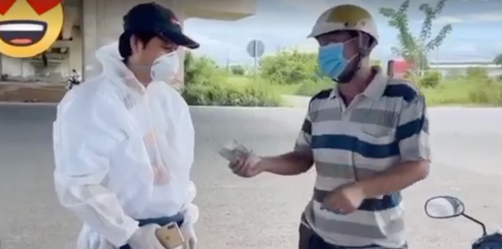 Trước hành động bất ngờ, người mặc đồ bảo hộ giật mình, vôi xua tay từ chối: "Thôi! Trời ơi giữ đi khổ quá. Sáng ra đứng chưa trao tiền cho bà con mà đã nhận tiền trước rồi".