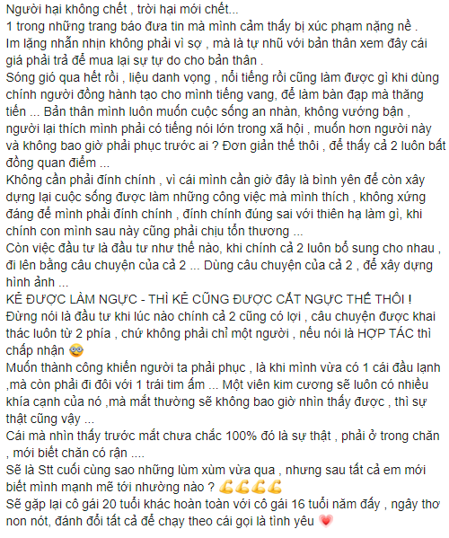 Đoạn status thông báo chia tay của Minh Khang tưởng chừng như rất lịch sự và êm đẹp thì bất ngờ, đến chiều cùng ngày cả hai lên tiếng "bóc phốt" nhau.