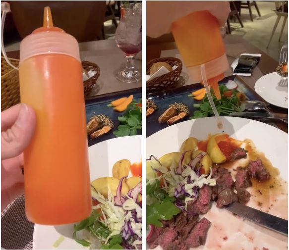 Nhìn cách trình bày món ăn trên đĩa cũng như không gian xung quanh, có thể thấy nhà hàng này khá sang trọng đúng theo những gì chủ nhân đoạn video nói. Tuy nhiên, thứ bị anh chàng nhận xét "kém sang" nhất chính là chai tương ớt bằng nhựa - hình ảnh vô cùng quen thuộc ở những hàng quán bình dân, lề đường.