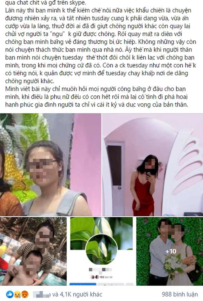 Mình viết bài này chỉ muốn hỏi mọi người công bằng ở đâu cho bạn mình, khi đều là phụ nữ đều có con hết rồi mà lại cố tình đi phá hoại hạnh phúc gia đình người ta chỉ vì cái ích kỷ và dục vọng của bản thân".