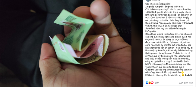 Kèm theo lời chia sẻ là hình ảnh "chiến lợi phẩm" của anh chồng, lần này ngoài 100k như thường lệ, anh còn được vợ "thưởng" thêm tận...50k.