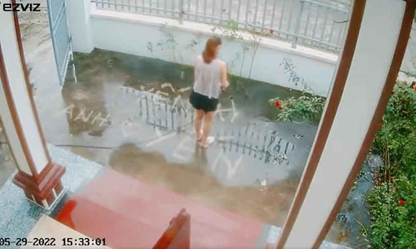 Theo trích xuất từ camera của ngôi nhà, một người vợ đang dùng vòi xịt để rửa sân. Thế nhưng, không đơn thuần chỉ là làm sạch nhà cửa, cô nàng còn nhân cơ hội này để thể hiện tình cảm với chồng theo cách 'bá đạo'.