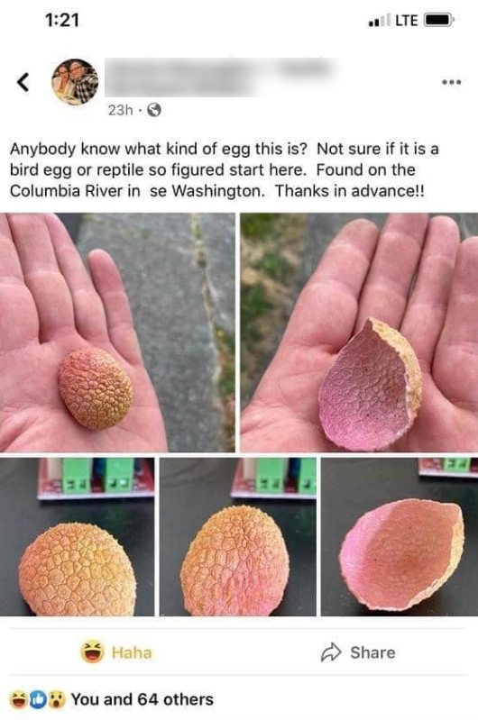 Nguyên văn câu hỏi của người đàn ông này khi được dịch sang tiếng Việt: "Chào mọi người. Có ai biết đây là loại trứng gì không? Nhìn có vẻ như của một loài chim hay bò sát gì đó. Tôi tìm thấy nó ở bờ sông Columbia (Washington). Ai biết thì chỉ giúp tôi đi. Tôi cảm ơn".