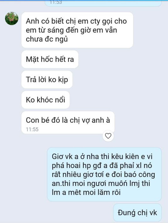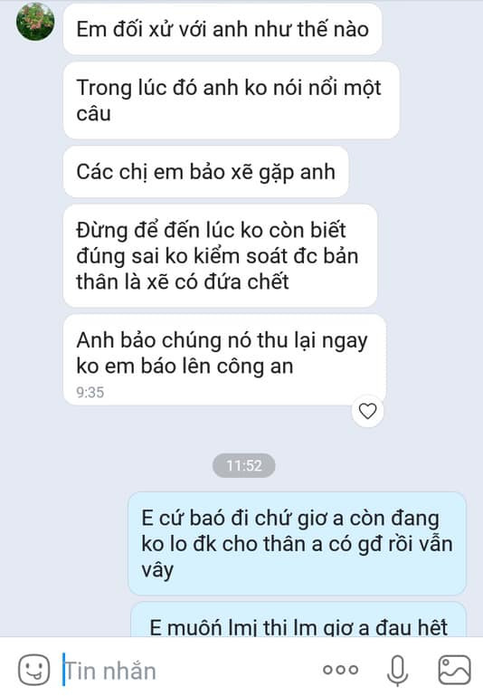 Drama còn chưa dừng lại ở đó, ngay sau khi đoạn clip được chia sẻ, kẻ thứ 3 kia còn đe dọa: "Em đối xử với anh như thế nào. Trong lúc đó anh không nói nổi 1 câu. Các chị em bảo sẽ gặp anh. Đừng để đến lúc không còn biết đúng sai, không kiểm soát được bản thân là có đứa chết. Anh bảo chúng nó thu lại ngay không em báo lên công an".