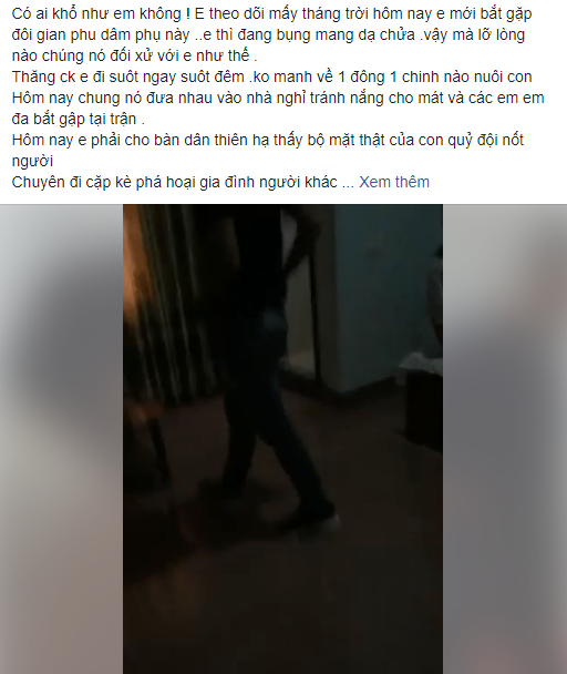 Chồng em đi suốt ngày suốt đêm, không mang về 1 đồng 1 chinh nào nuôi con. Hôm nay chúng nó đưa nhau vào nhà nghỉ tránh nắng cho mát và các em em đã bắt gặp tại trận. Hôm nay em phải cho bàn dân thiên hạ thấy bộ mặt thật của con chuyên đi cặp kè phá hoại gia đình người khác".