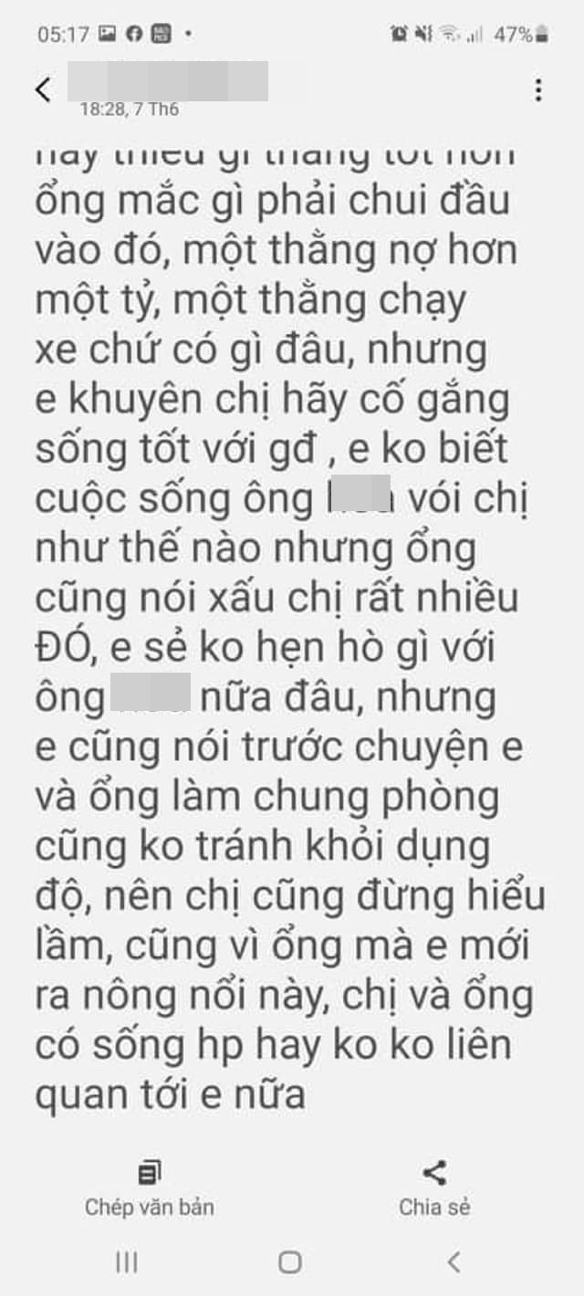 "Chị tưởng em yêu anh H thật à? Chẳng qua em lợi dụng ổng tí thôi. Trên đời này thiếu gì đàn ông tốt hơn mà phải chui đầu vào đó? Một thằng nợ hơn 1 tỷ, 1 thằng chạy xe thôi chứ có gì đâu?