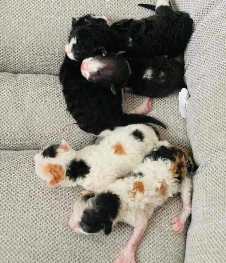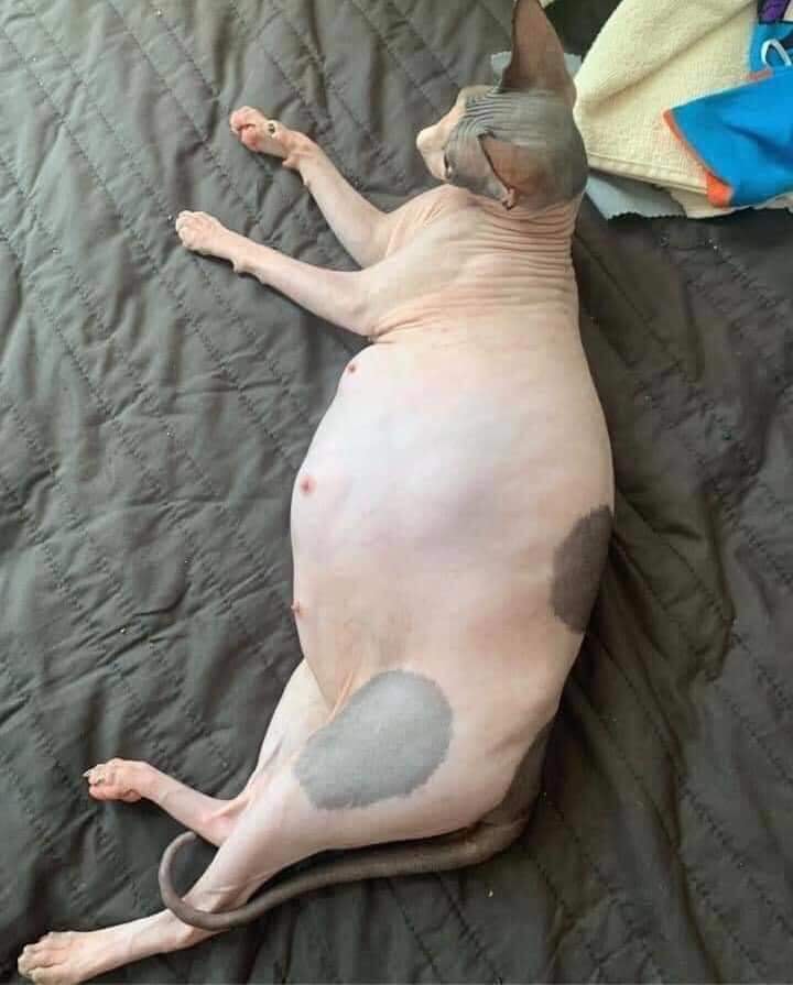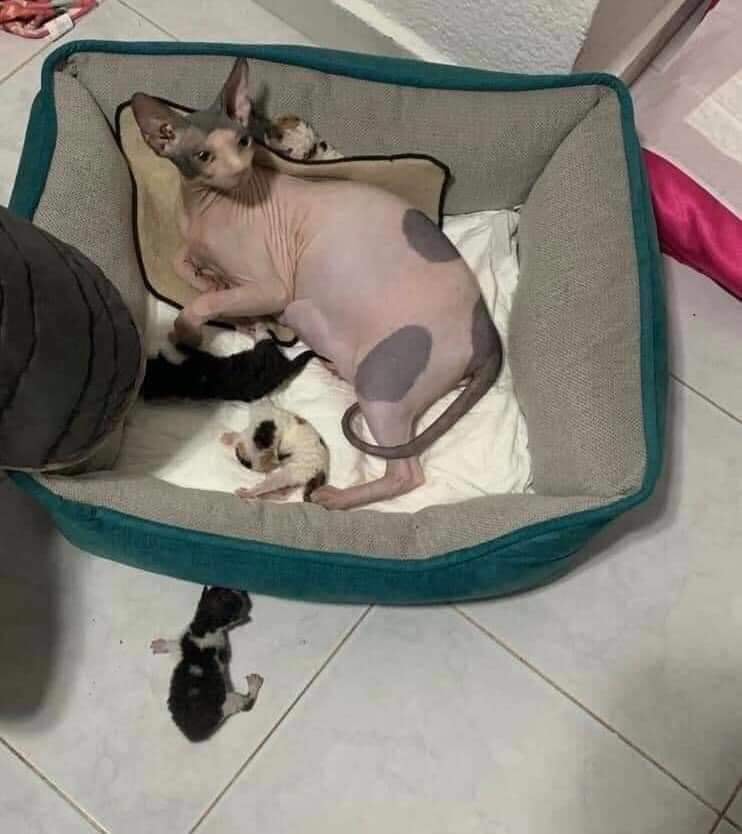 Chính bởi đặc trưng như thế nên rất khó nhầm lẫn mèo Sphynx với những loài mèo khác. Chúng đẻ con ra cũng nhẵn nhụi vô cùng, không hề có tí tẹo lông nào cả. Nhưng thật kỳ lạ làm sao khi cặp đôi Sphynx dưới đây lại sinh được một đám mèo con lông lá sặc sỡ, khiến cho vô số người ngạc nhiên.