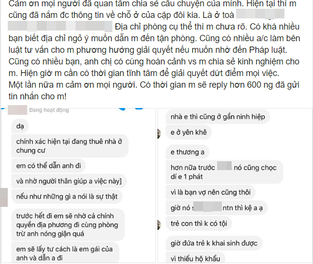 Mới đây nhất, anh C. cũng đã đăng tải thêm những dòng trạng thái tiếp theo. Nhiều người nhắn tin đến muốn được giúp đỡ anh, trong đó cũng có hàng loạt người biết nơi ở hiện tại của L. và tình nhân, sẵn sàng dẫn anh đi gặp mặt. Thậm chí, đồng nghiệp cũ của nhân tình hay bạn bè vợ anh C. cũng nhắn tin đến để hỏi han.
