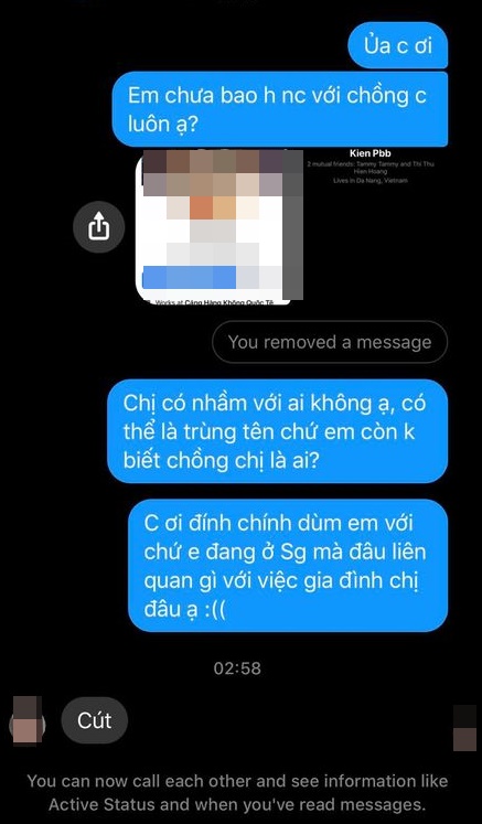 "Thật tình mình chưa từng kết bạn hay nói chuyện với chồng của chị này. Mình ngay sau đó đã nhắn tin để thanh minh nhưng chị chỉ nhắn lại đúng một chữ: 'Cút'. Mình đã không ngủ suốt đêm và chẳng biết phải giải quyết thế nào. Sáng hôm sau mình đành đưa lên chính quyền để giải quyết câu chuyện này", Ngọc chia sẻ.