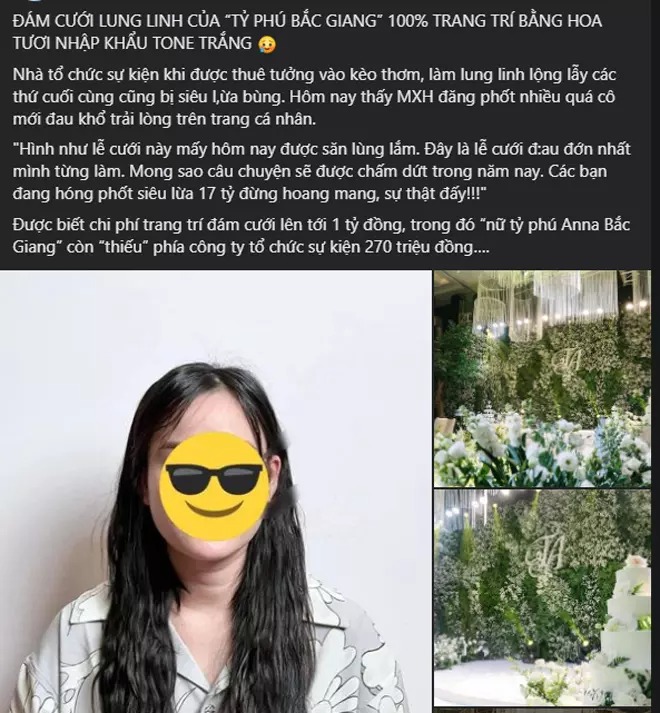 Phía công ty tổ chức sự kiện cũng định không lên tiếng nhưng mấy hôm nay thấy MXH đăng phốt nhiều quá cô mới đau khổ trải lòng trên trang cá nhân: "Hình như lễ cưới này mấy hôm nay được săn lùng lắm. Đây là lễ cưới đau đớn nhất mình từng làm. Mong sao câu chuyện sẽ được chấm dứt trong năm nay. Các bạn đang hóng phốt siêu lừa 17 tỷ đừng hoang mang, sự thật đấy!!!"