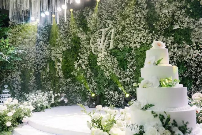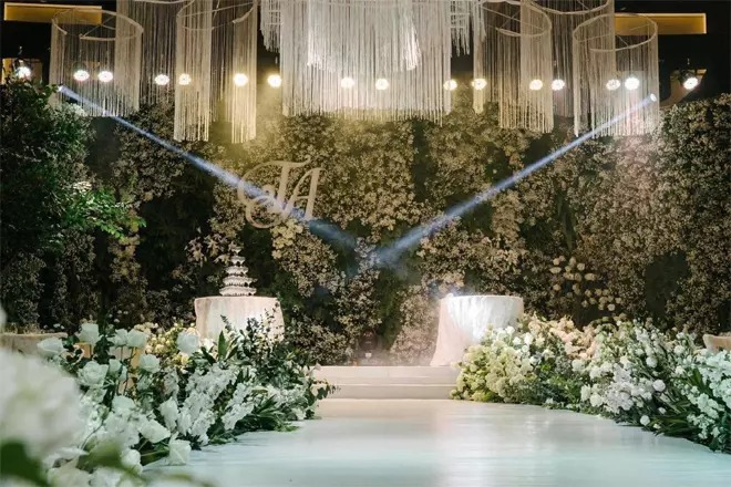 Riêng hoa cưới, cô thuê một công ty tổ chức sự kiện, trang trí toàn bộ tiệc cưới bằng hoa tươi nhập khẩu, tone trắng 100%. Chi phí cho việc trang trí này lên tới 1 tỷ đồng.