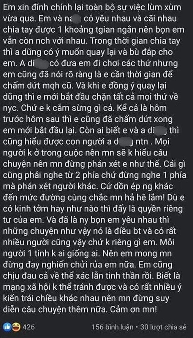 “Em và N. có yêu nhau một thời gian ngắn nên bọn em vẫn còn nói chuyện. Trong thời gian chia tay thì anh D. (người đàn ông bị cắm sừng) có ý muốn quay lại và bù đắp cho em. Anh D. có đưa em đi chơi các thứ nhưng em đã nói rõ ràng là cần thời gian để chấm dứt mối quan hệ cũ. Khi em đồng ý quay lại với D. thì em mới bắt đầu chặn mọi thứ về người yêu cũ”, cô gái bày tỏ.