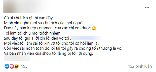 Bài đăng xin lỗi của người chồng sau đó cũng nhận được nhiều sự chú ý nhưng thái độ xin lỗi "thành khẩn" của anh ta càng khiến cư dân mạng, đặc biệt là hội chị em phẫn nộ. Bởi dù anh ta có nói hay bao nhiêu thì câu cuối cùng cũng đã bộc lộ mục đích chính là muốn bảo vệ nữ nhân viên làm tiểu tam: "Còn việc sai hoàn toàn do lỗi tại tôi, gây ra cho người tổn thương là vợ. Và bạn nhân viên của shop tôi là người bị tôi lợi dụng".